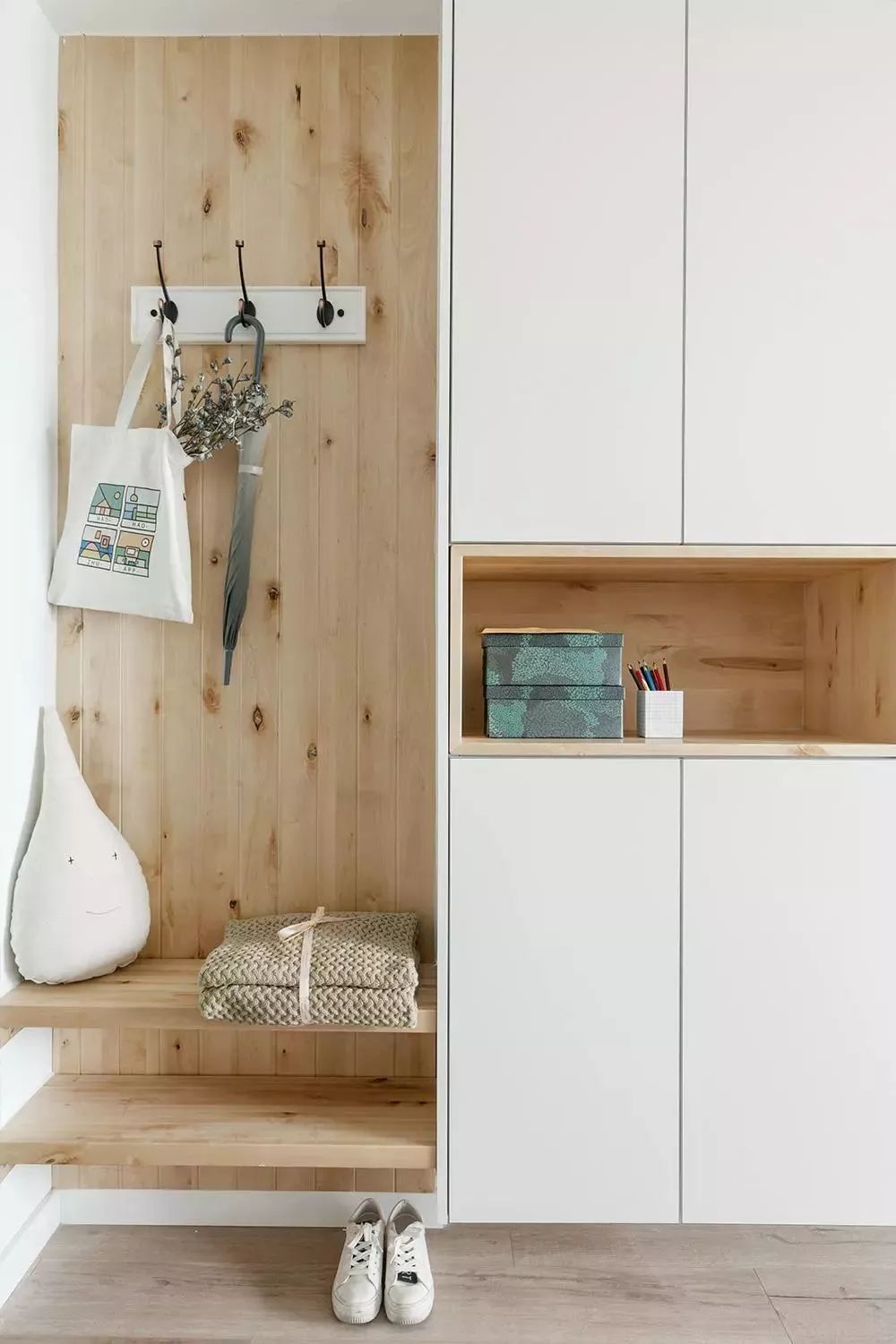玄关使用原木加白色密度板,色调简约清新,半开放式的柜子让空间留有余地,右侧中间部分采用了镂空设计,用绿植、艺术品、等凸显装饰性能,是非常实用的选择,可以放平时换的拖鞋和常用的鞋。