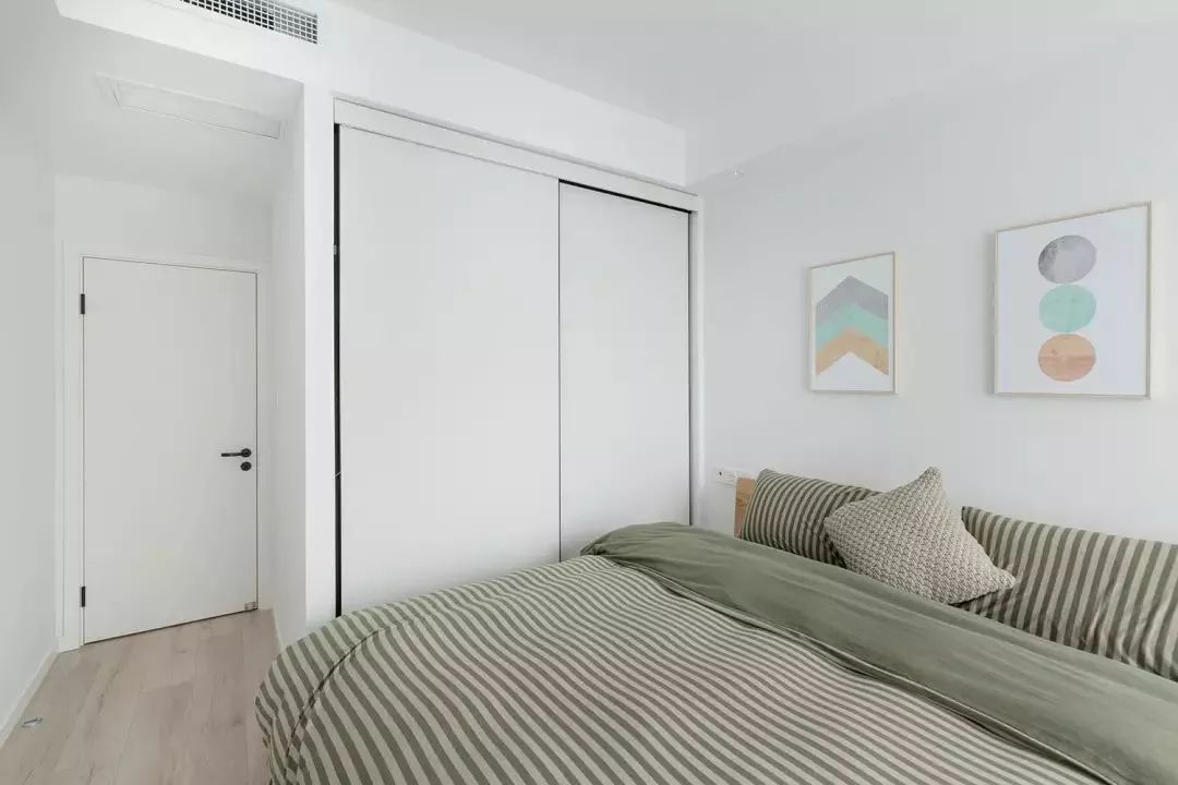 主卧打造了一个简约白色的整体空间,就主卧的尺寸做成的推拉门柜体,增加了些许线条感。