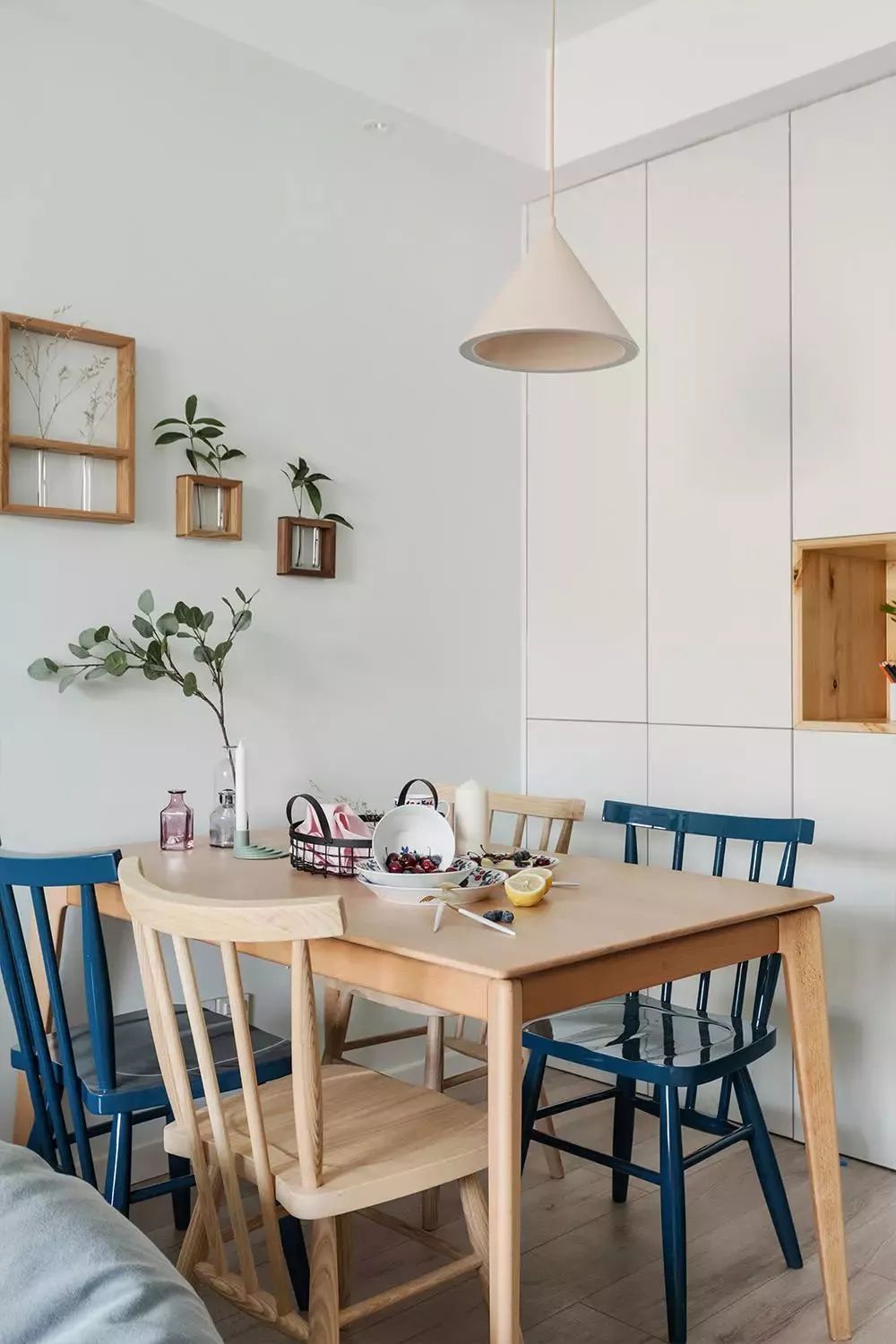 原木色的餐桌椅,同时搭配两把蓝色的跳色椅,还有粉色的吊灯。与墙体装饰相映成趣,同时定下了餐厅的调性。