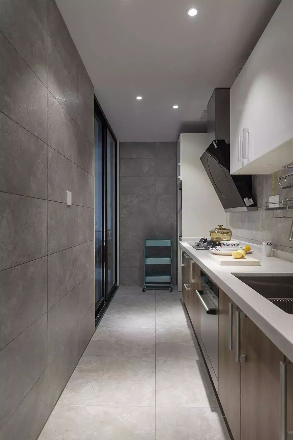 一字型的厨房,做了整体橱柜。灰色的大理石地面和墙面与木色的柜子显得整个空间格外温暖。