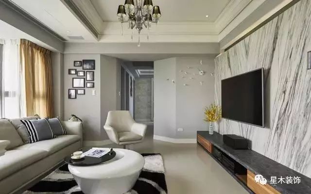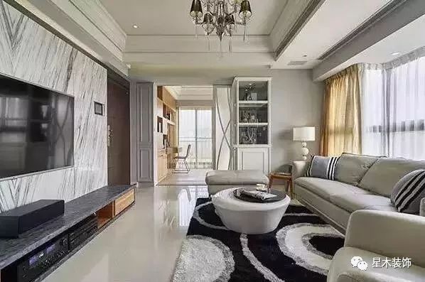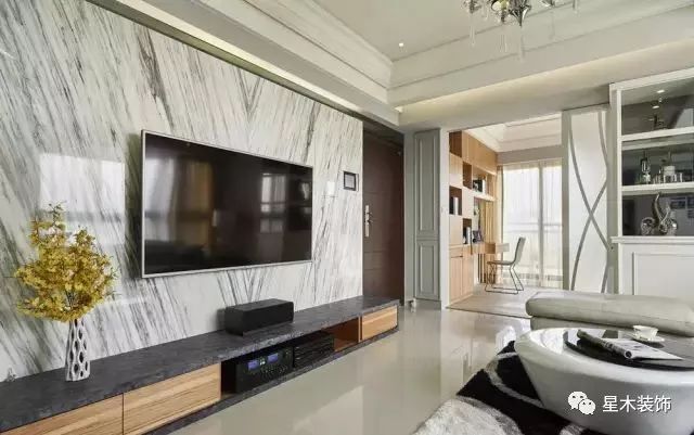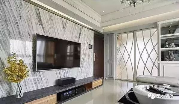 看看电视墙大理石的运用,使客厅的整体格调得到了瞬间升华,v字形的纹理无论是纵向还是横向都拉大视觉感。