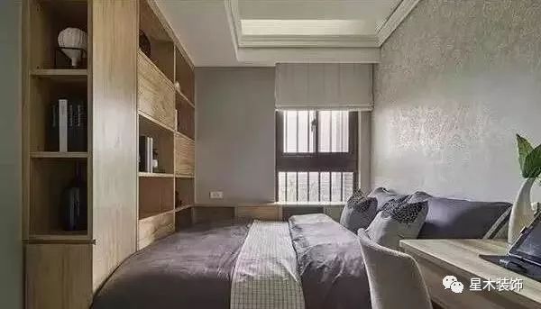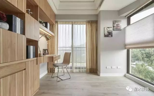 书房。原木色书柜搭佐窗外绿意,在简约线条的勾勒下,演绎了无印风格的自然设计语汇。