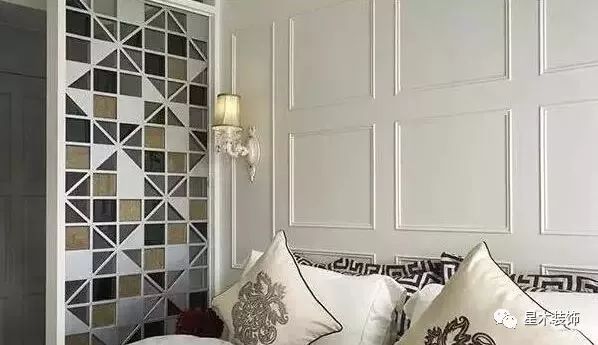 主卧。由铁工烧制而成的屏风,结合玻璃材质运用镶贴和嵌入手法,变化出丰富的几何造型,铺陈出室内最美的风景之一。