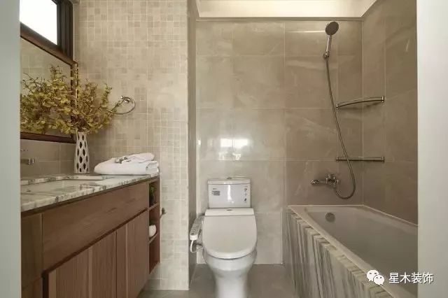 主卫。设计师以相近色系,结合磁砖、石材的纹理,围塑出如置身在自然大地的沐浴场域。