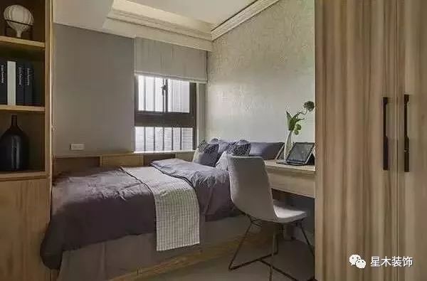 次卧。为修饰经过的梁体,天花采用斜面设计,反而营造出如天井的效果