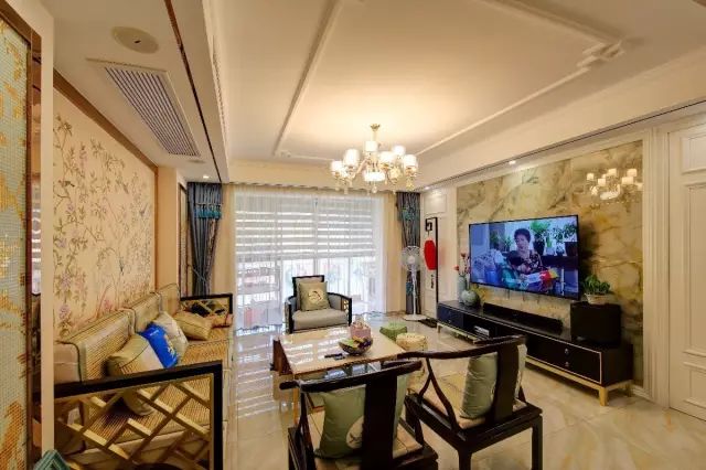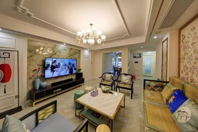 客厅电视墙是独特纹理的大理石,黑色电视柜上边摆着禅意的中式花瓶,整体氛围显得轻松又闲适;金属框架的大理石茶几,结合中式藤椅的沙发,充满了实用闲适的氛围感。