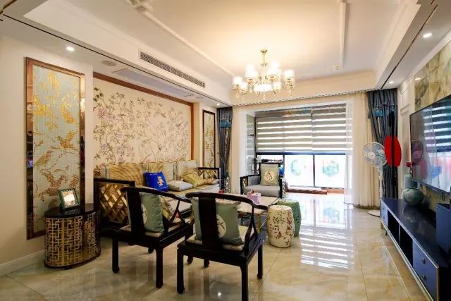 沙发墙则以中式儒雅的清新图案,结合太师椅与鼓凳,充满了中式的禅意韵味。