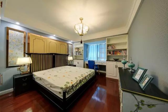 主卧床头做了个对称的造型,以金属框架的精致挂画,搭配硬包床头;黑色实木床,在靠窗位置摆个书架组合书桌,整体实用美观两不误。