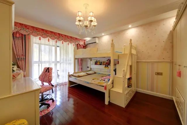 儿童房的墙面装了腰线,下部分是鲜艳多彩、上部分则是粉嫩可爱的壁纸,搭配一张实用的上下床,一个小书桌,功能方面比较强大,空间整体也算较为宽敞。
