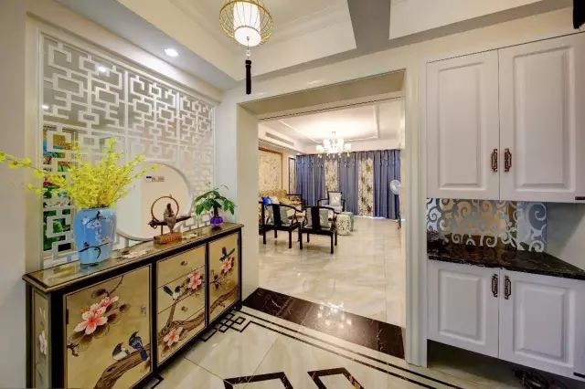 玄关处做了个隔断玄关柜,这是一个很具中式传统风韵玄关柜,结合上白色的玄关屏风、禅意的新中式软装摆饰,让人一进门就感受到了一幅古韵的气息;同时玄关右手边则是一个鞋柜,提供了充足的入户收纳空间。