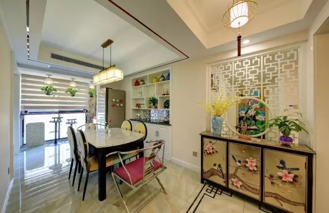 玄关柜的左边,则是餐厅区域,整体以简洁清新的新中式风格搭配,呈现出一个高档优雅的氛围感。
