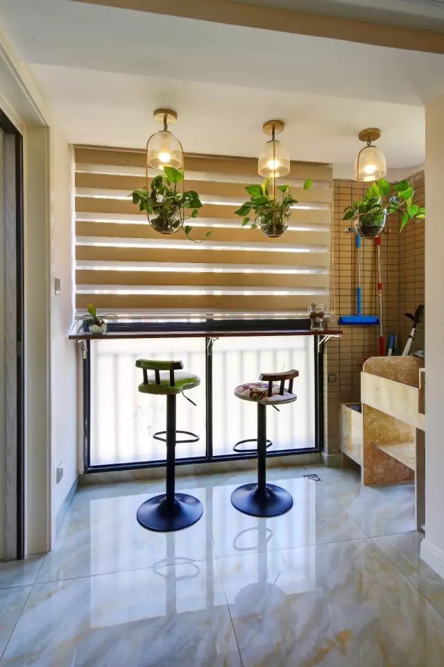 餐厅旁的阳台打通后在靠窗位置装了个小吧台,吊灯下方还挂上了清新情趣的绿植,整体充满了精致舒适的氛围感;而一旁着做了个砖砌的洗衣台与拖把池,方便又实用。
