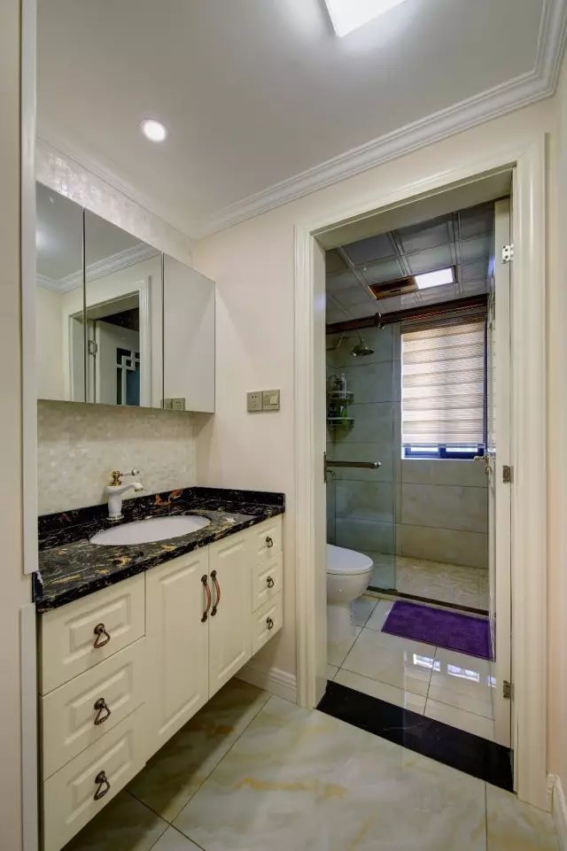 卫生间把洗手盆安排在门外,采用玉质的地砖,在温润的空间基调搭配下,打造出一个舒适又温馨的氛围。