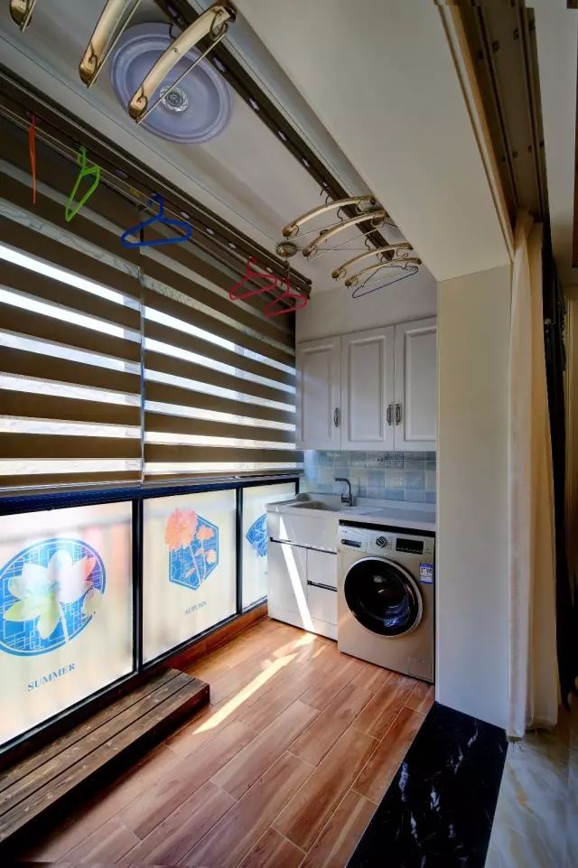 阳台装了双排的升降式晾衣杆,封闭式的阳台,打通了内部空间后整体显得格外的舒适大气。