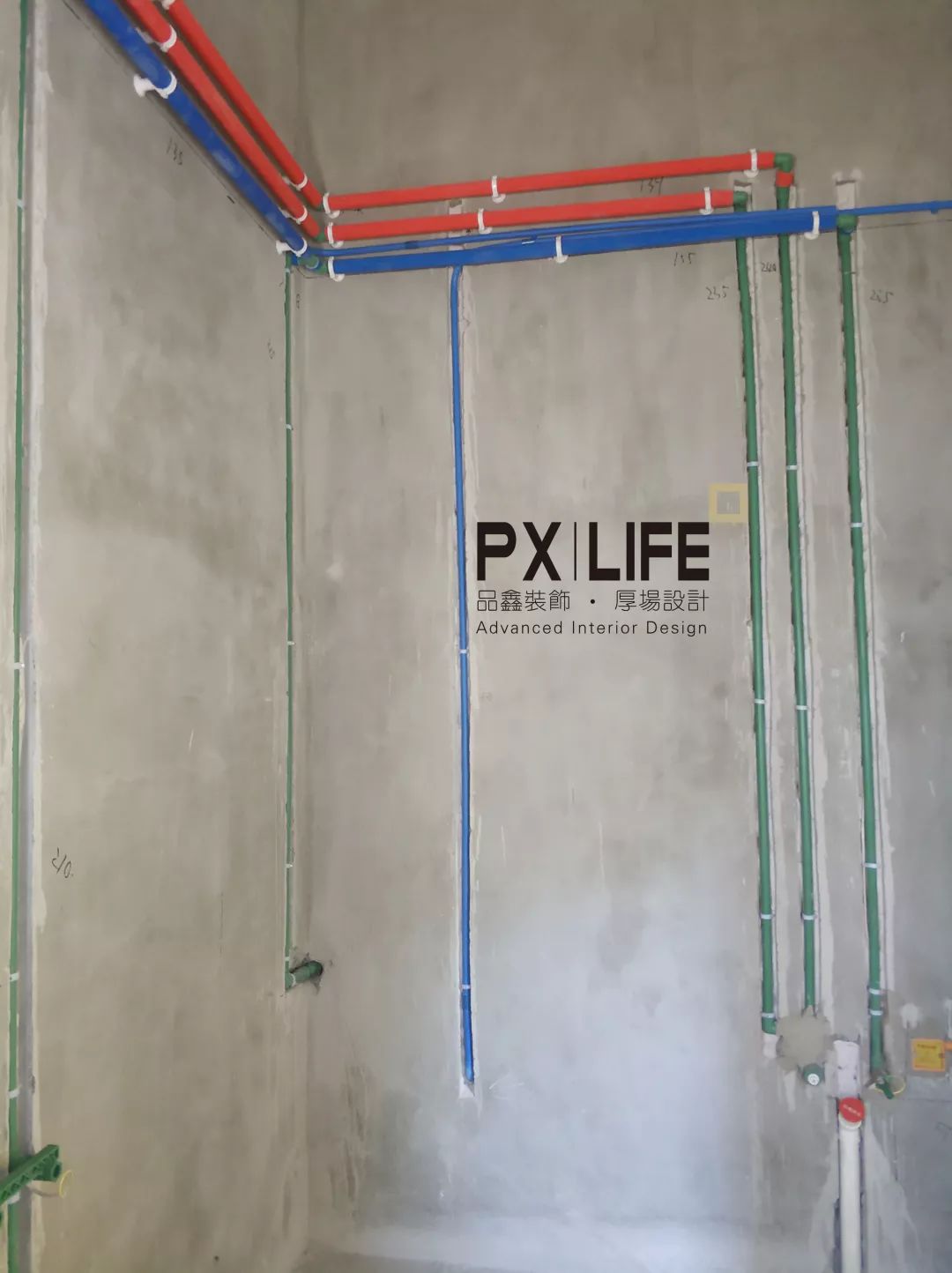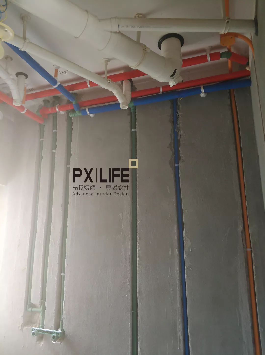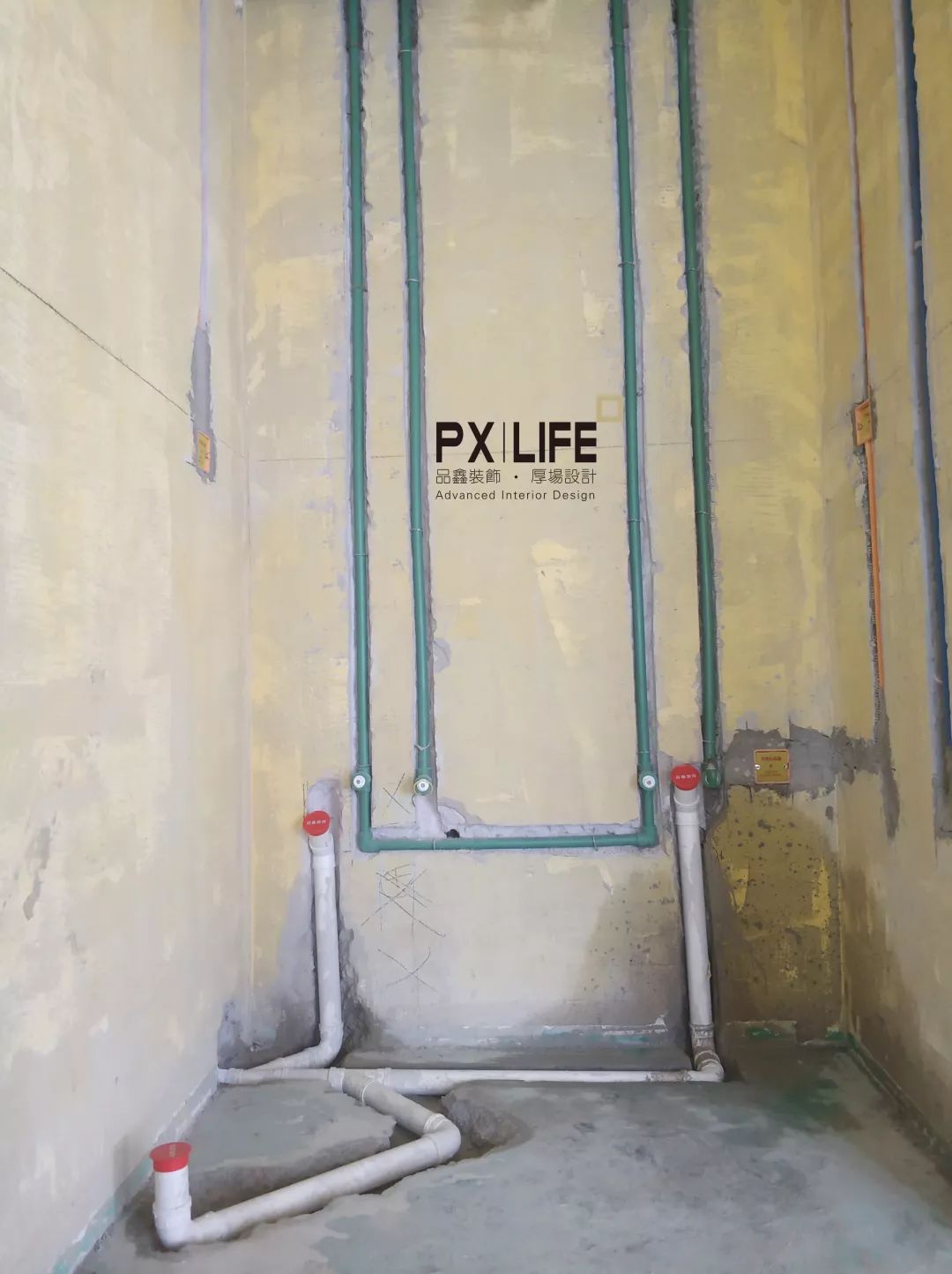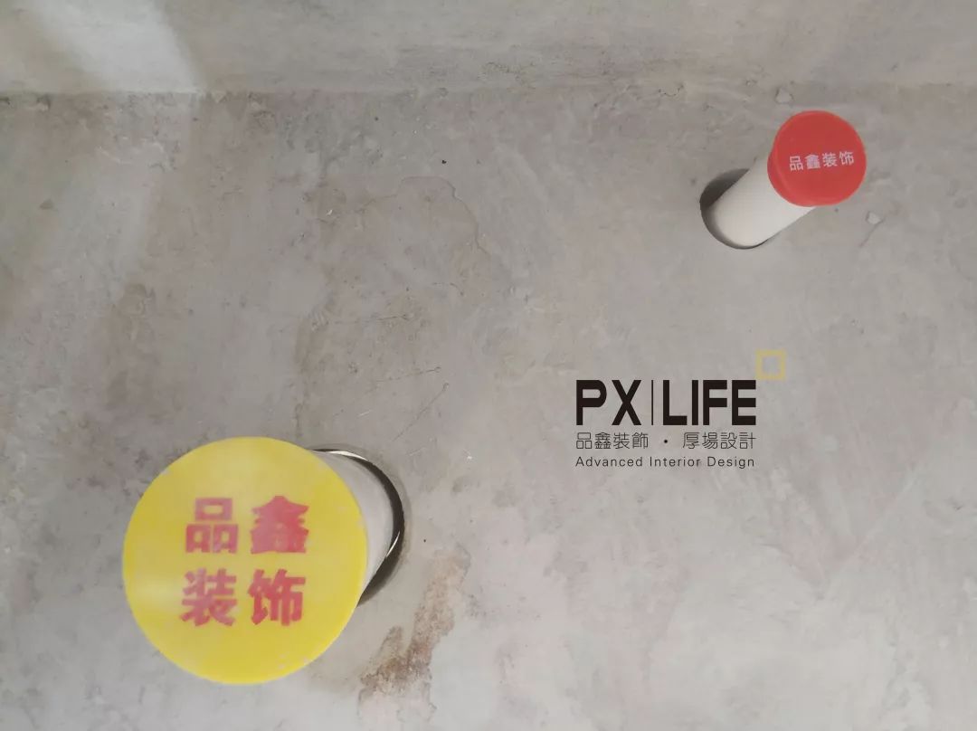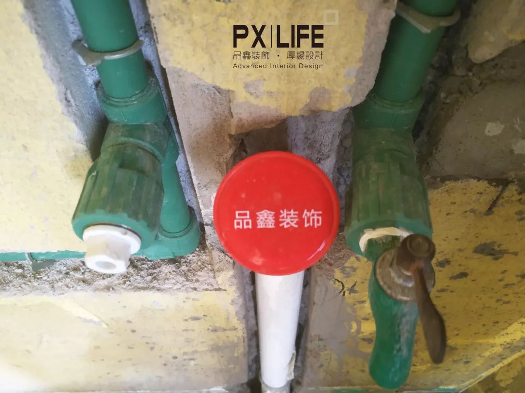 卫生间水管竖直,下水管使用标有品鑫装饰字样的管帽保护。