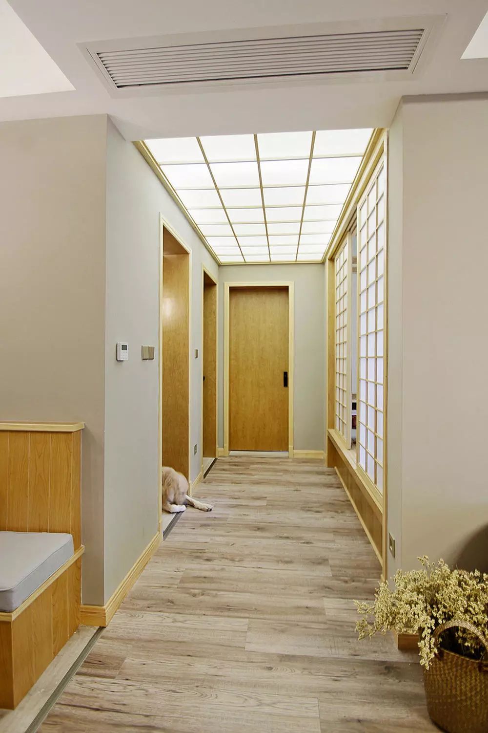 原有过道过于狭长,将书房墙体拆除后加宽过道。天光顶的引入也弱化了通道的感觉,使整个空间更加通透明亮。