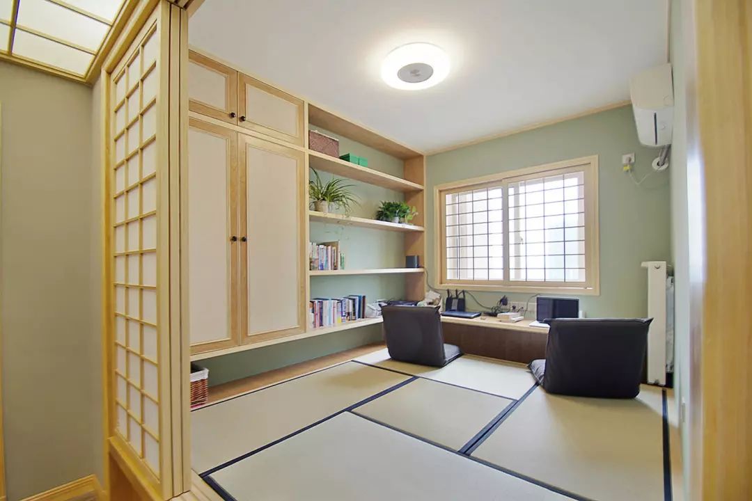 书房采用了榻榻米的构成形式,内置升降桌。平时可在此处办公会客,若是友人留宿,则兼备客房的功能。