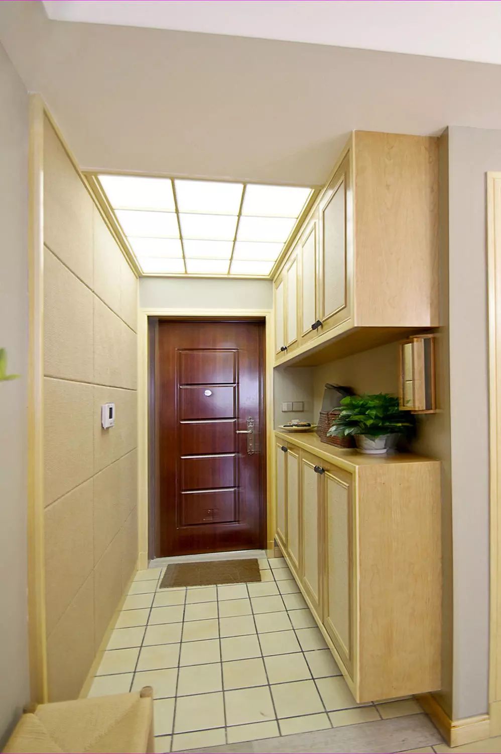 天光顶的运用,让吊顶后玄关不会显得压抑。墙面采用棉麻进行硬包,整洁大方。现场制作鞋柜,中空一段可放置包包钥匙等小物件,十分便捷。