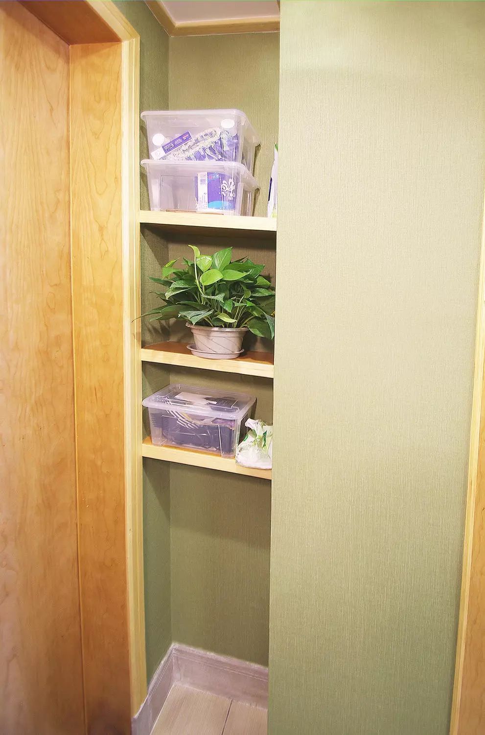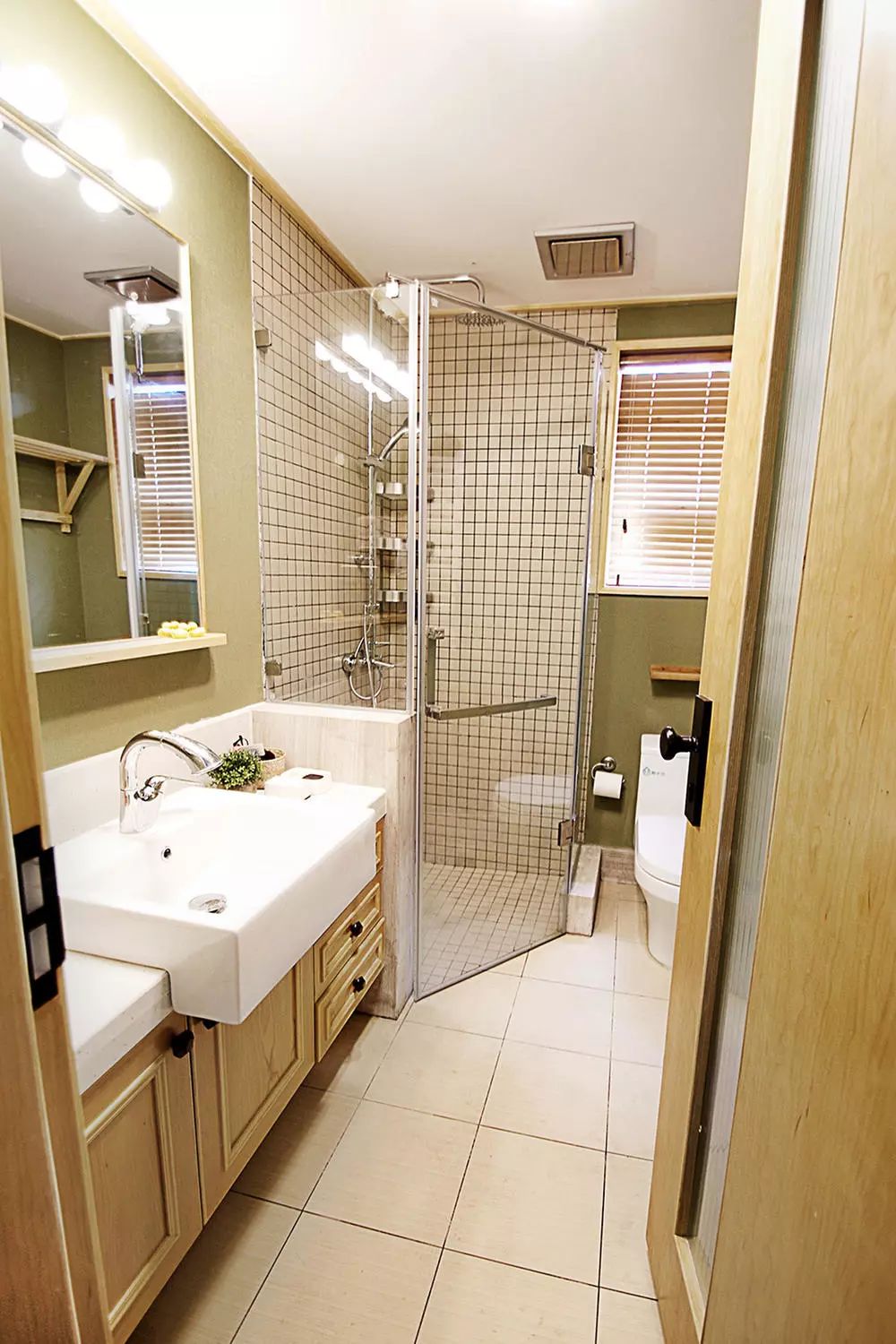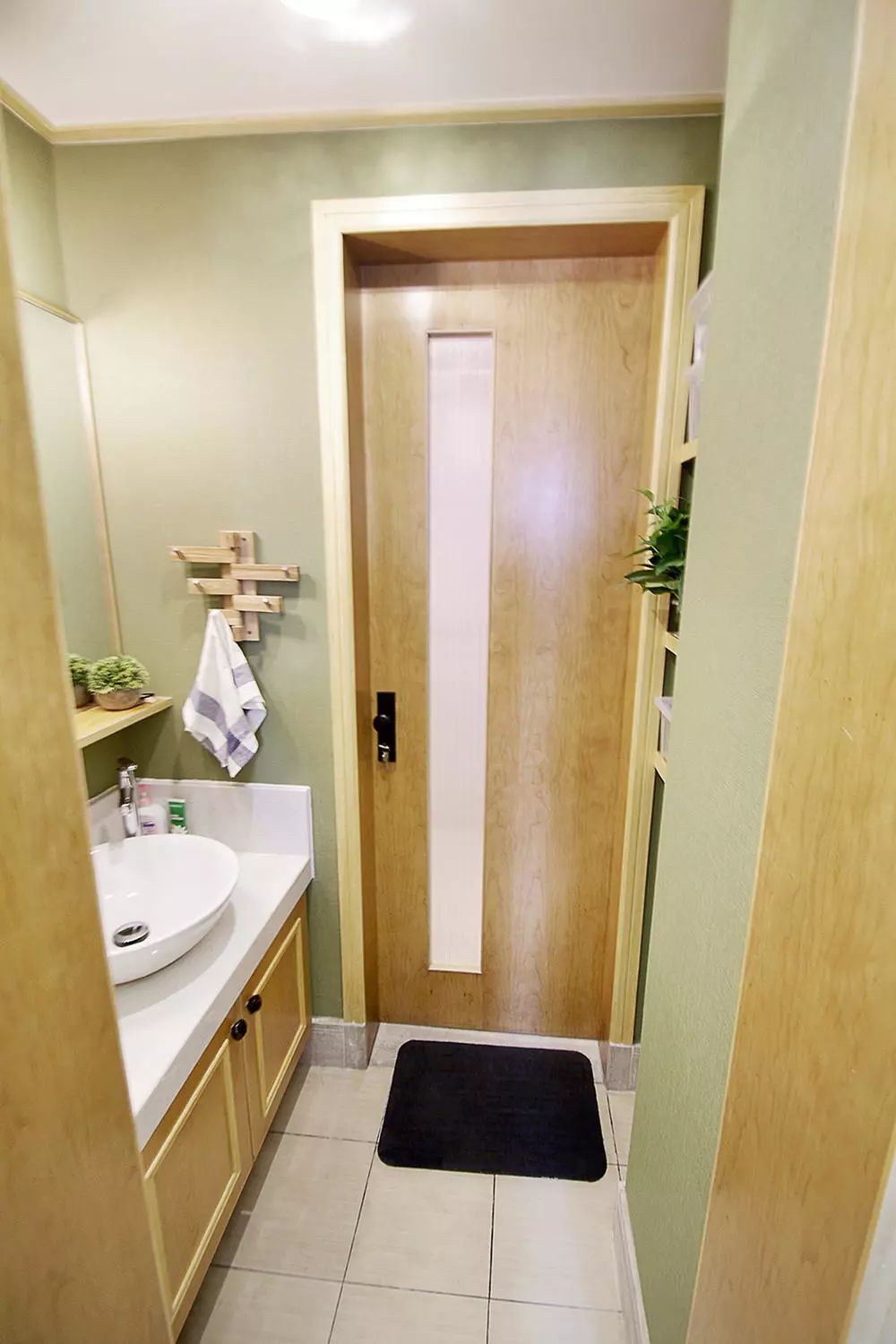 洗手台对面则是将原有户型的缺陷进行优化,形成了有收纳功能的隔断。