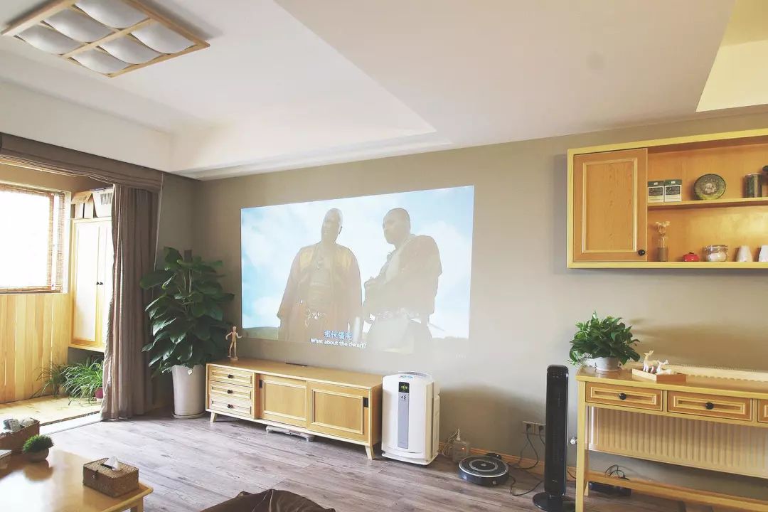 客厅没有使用常规的电视墙,而是直接用整面投影墙取而代之,形成一个专属的家庭影院。旁边的茶水台,不仅可以遮挡暖气片,也可以起到连接客餐厅的作用。