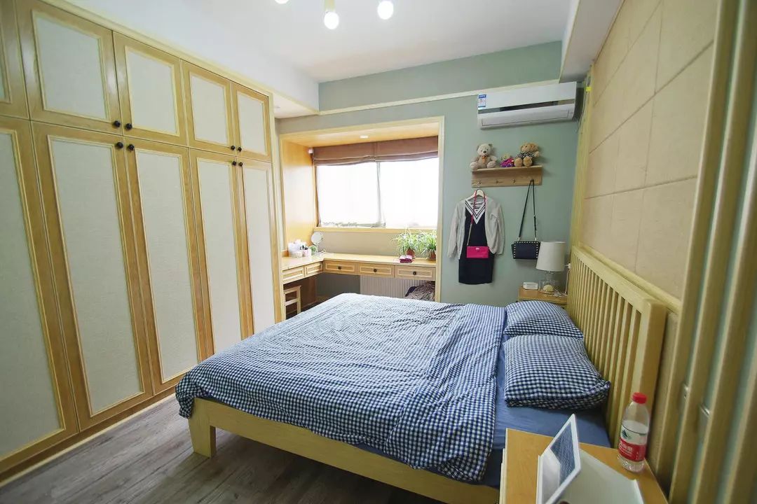 主卧床头背景与玄关做法一致,转角内摆放了现场制作的梳妆台,对其进行了优化处理。