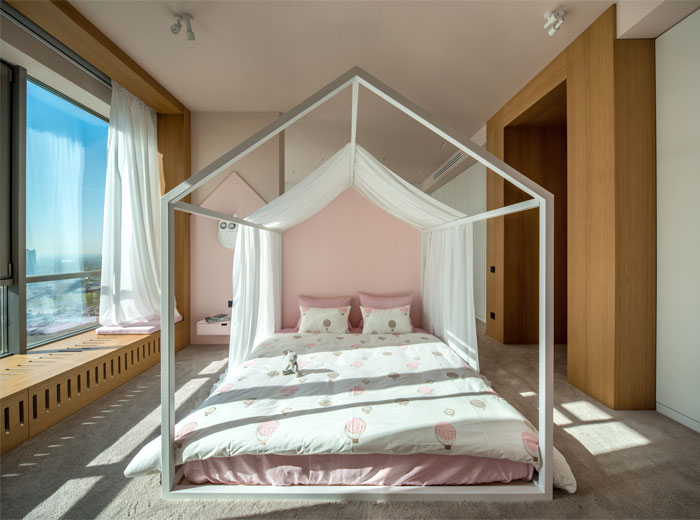 明亮通透的空间是一个整体,只在各区域之间有微小的隔离,或是承重墙,或是一扇玻璃,就把它们划分开,又有机结合起来了。为了使开放式的空间各区域显得协调,本案采用了统一的纯色屋顶和木地板,在各区域内则用了不同但跳跃性较小的色彩搭配,制造出了空间的层次感。设计师唯独把卧室放在了特殊位置,粉色的屋顶和床榻显得温馨浪漫,均匀的毛绒地毯给人舒适自然的感觉。BROTHER丨重庆兄弟装饰,1对1原创倾心设计,让品质生活触手可及。