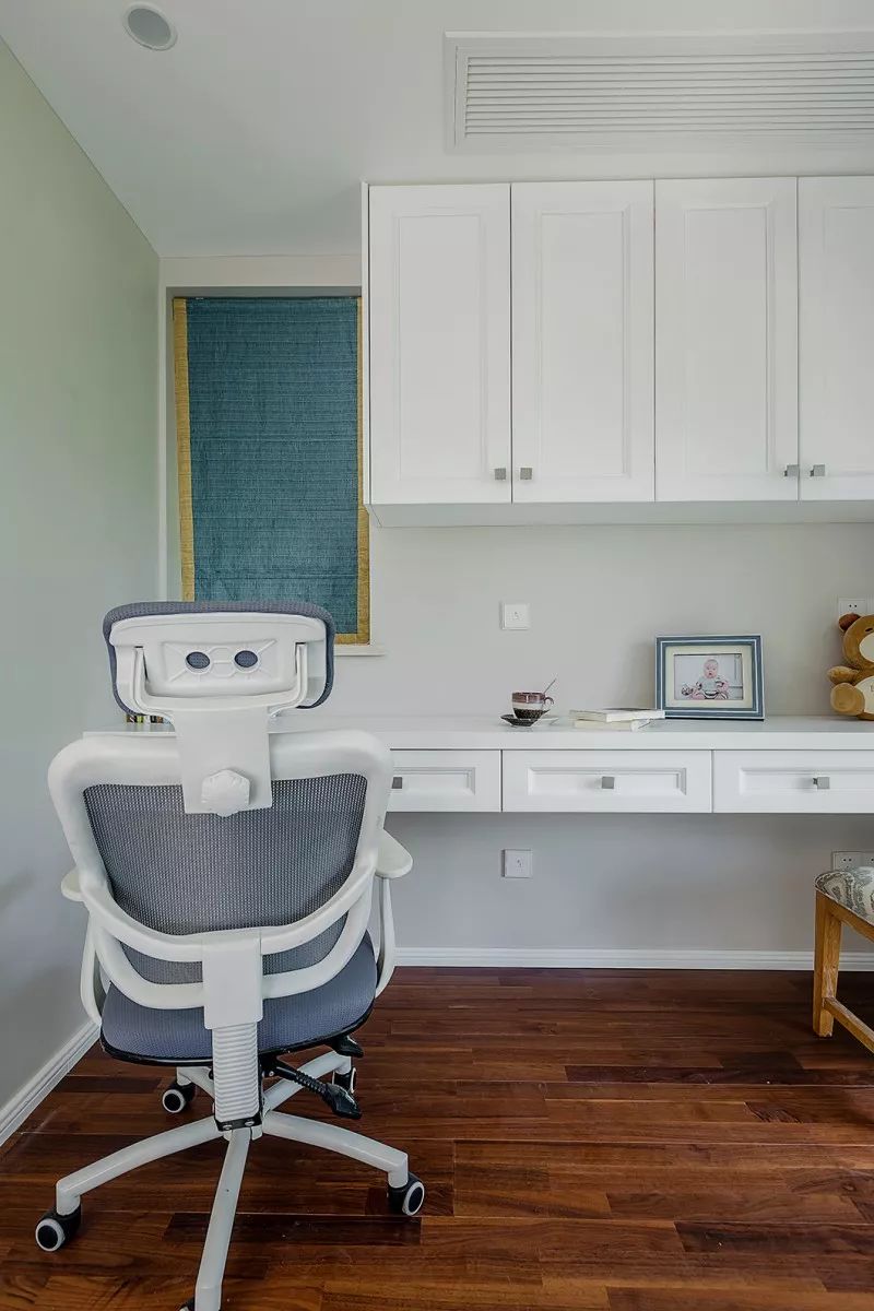 一字书桌的设计,扩大了脚下的活动空间,抽屉及收纳柜的设计,满足了书房收纳的需求