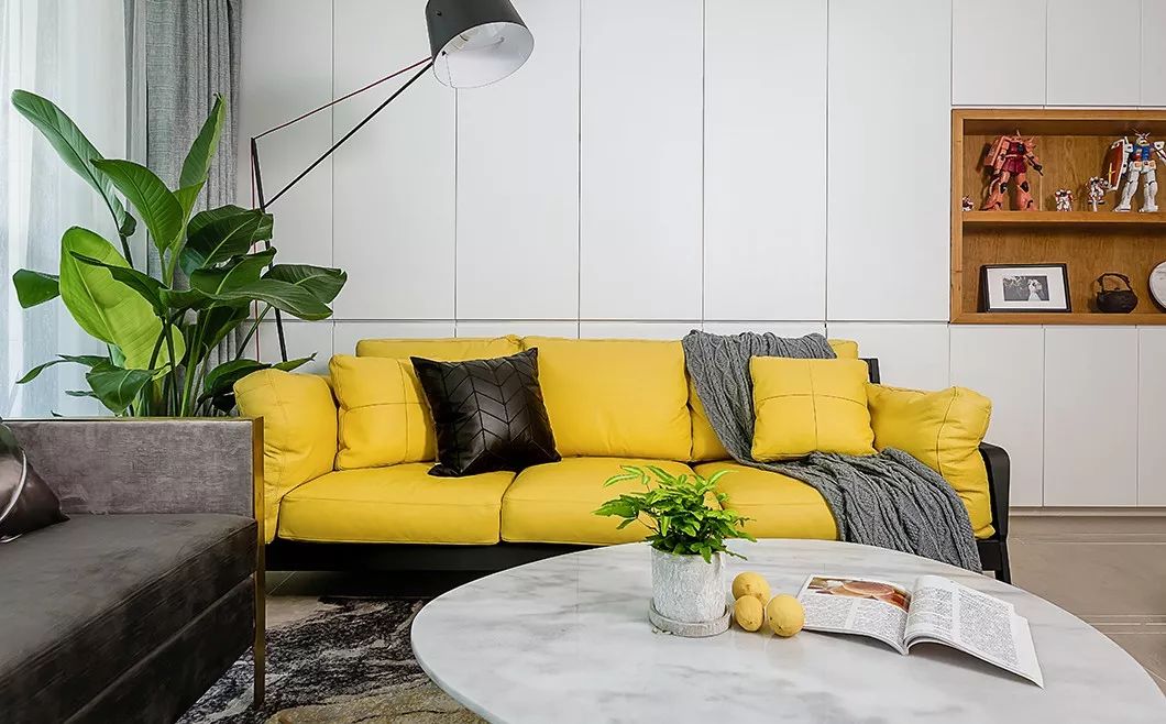 客厅白色收纳柜为背景墙,柠檬黄沙发让温馨、舒适的居住氛围再次提亮,仿佛无形中有一种向上的精神力量,绿植,大理石茶几让整个空间迷漫着清新又精致的气息