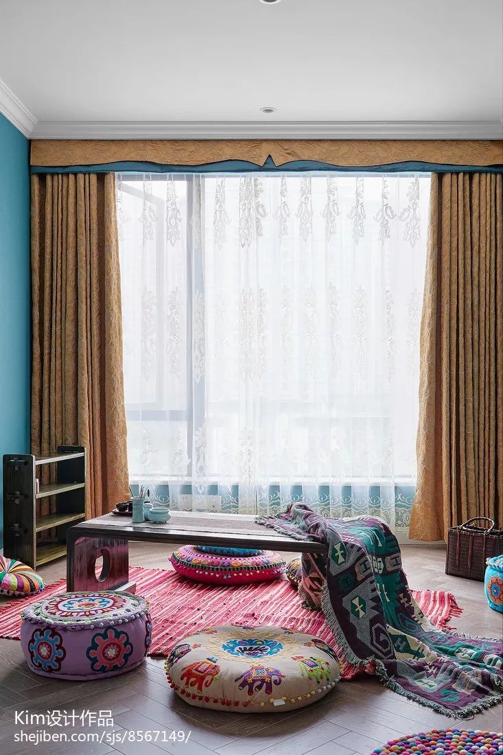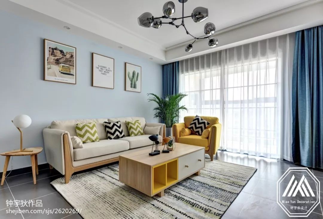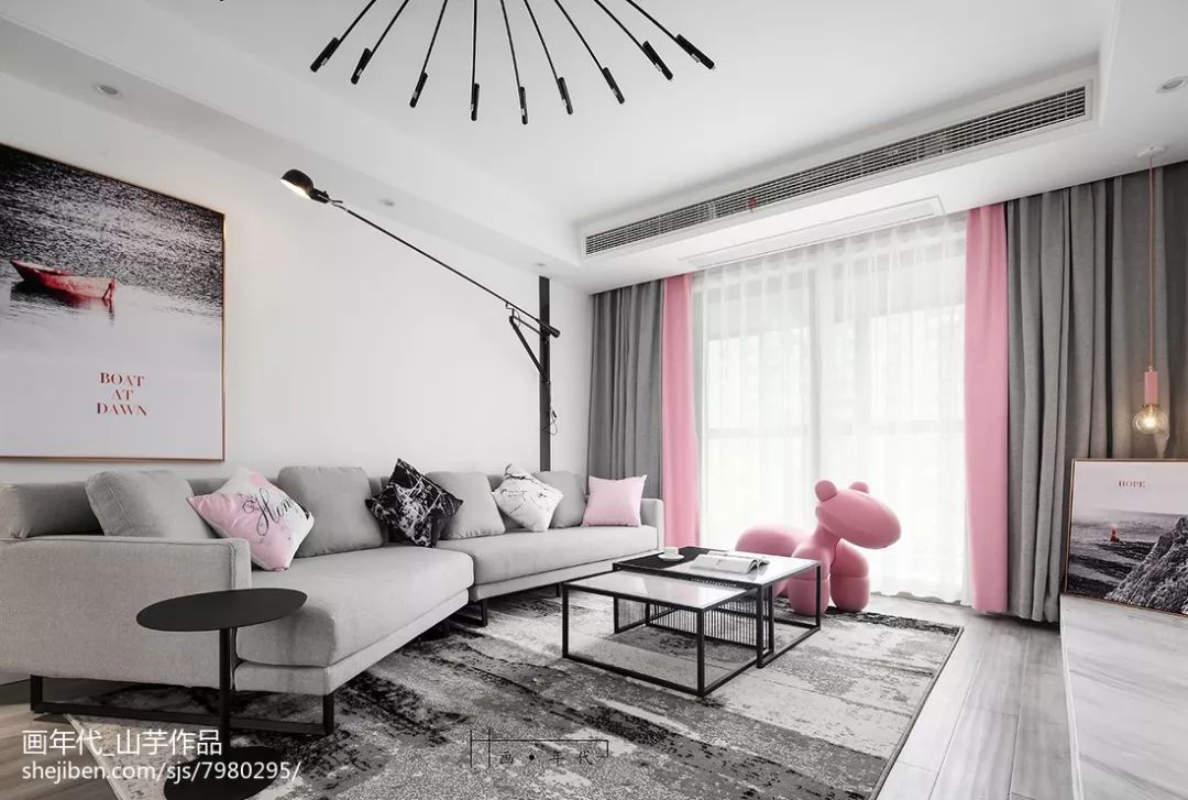 粉色、黄色和蓝色的窗帘既不花哨又不会单调无趣,且与沙发、墙体颜色融成一个十分和谐的视觉整体