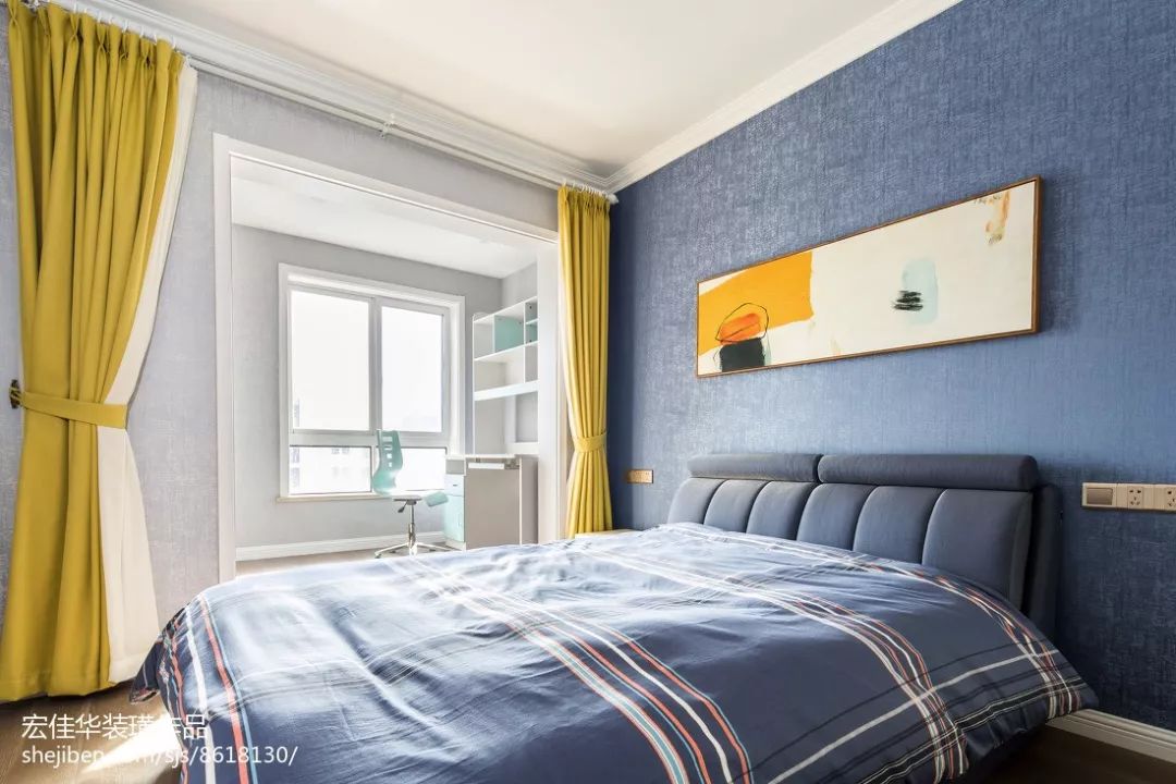 色彩方面不宜大面积的使用高饱和和高对比的颜色,面料尽量选择厚实有质感并且遮光效果好的,如果单层布料不能满足遮光要求,加上一层衬布不仅可以提升遮光效果同时还具备保温隔音的效果,有效提升房间的舒适度