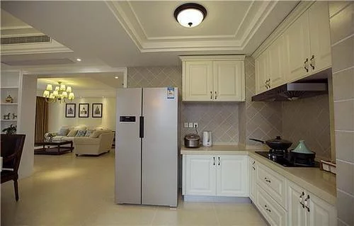 厨房采用了开放式的,空间显得十分的宽敞,吊柜到顶的设计,没有什么后顾的清洁烦恼