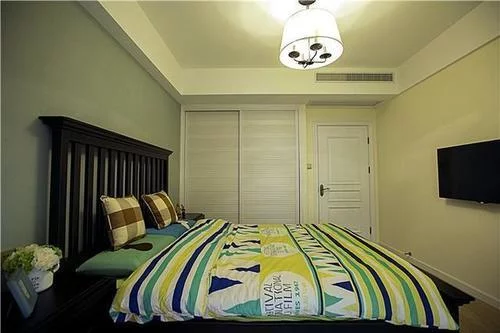 这里是主卧室,大衣柜后面是卫浴间,因为怕卫浴间边上连着衣柜会容易受潮,所以卫浴间在装修的时候做足了防水功能
