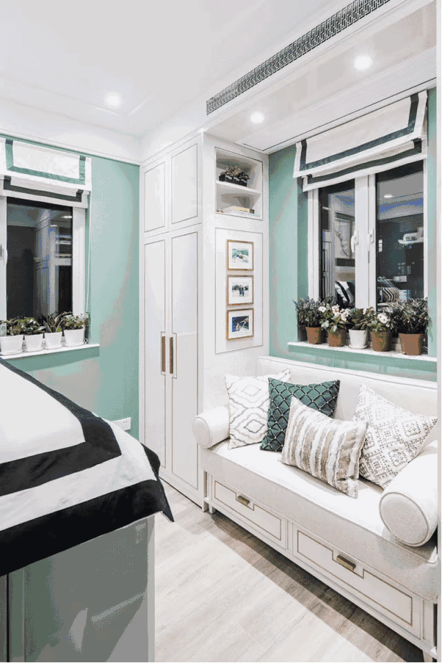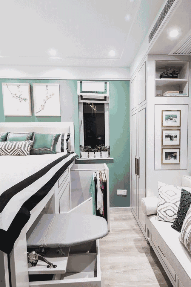 爆改38㎡超小户型,住下一家五口,我们具体来看看设计师是如何做到的:厨房=大厨房+早餐台,扩大后的厨房,明亮整洁,白色和蓝灰色的橱柜,嵌入式抽油烟机,厨房的早餐台可以转出来与橱柜链接,变成备餐区、操作台;客厅=餐厅+书房+老人房+孙子房,利用率极高,茶几可变成餐桌,通过旋转升高,几面翻开面积翻倍,最多可容纳10人同时用餐,靠近阳台是孙子的升降床,可以变身沙发或者晾衣架,书桌或者烫衣台,一堵移动的墙可以把老人床和孙子空间隔开,互不打扰。夫妻房=卧室+衣帽间+咖吧+办公桌,打开一个衣柜可以拉出办公桌和咖吧,设计师把床抬高到1.2米,在床下面做了一个进入式的衣帽间。柜子里拉出来烫衣板、内衣收纳抽屉。卫生间=干区+湿区+洗衣房,马桶间和淋浴房之间设计了电控玻璃,保证两个空间同时拥有良好的采光,并且设置成自动模式,当两扇门当中有任何一扇门是关闭状态,透明玻璃变成磨砂状态,保证使用者的隐私。麻雀虽小,五脏俱全,房子再小,只要用心设计,也能脱胎换骨重生,怎么样,这套案例有没有惊呆你?