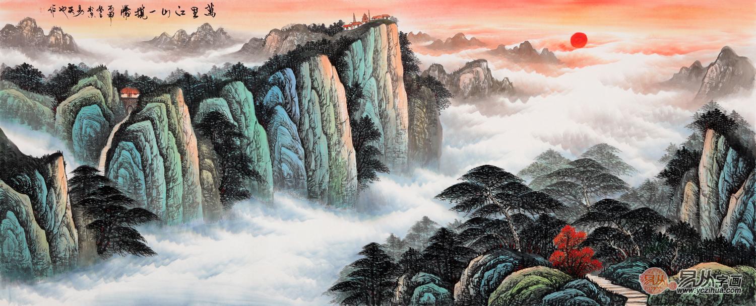 易天也最新力作八尺国画作品《万里江山一揽胜》 作品来源:易从网浩荡烟云存于山间,初升的太阳极具朝气,给人一种焕然新生的感觉,画面中山峦挺拔,在风水中山脉有着龙脉之说,山脉犹如人脉,山脉连绵长远,象征人脉多,交游广阔,根基雄厚。画面重峦叠嶂,层次丰富,有分支、有起伏者风水极佳,山间点缀的松树姿态万千,伞状的造型是一种挡灾避难的风水寓意,山峦之间一条道路通向峰顶的庙宇,步步高升,挂在客厅沙发后边最为合适,风水极佳!家里挂画推荐山水画第三款:流水生财图,财自水中来聚福运~