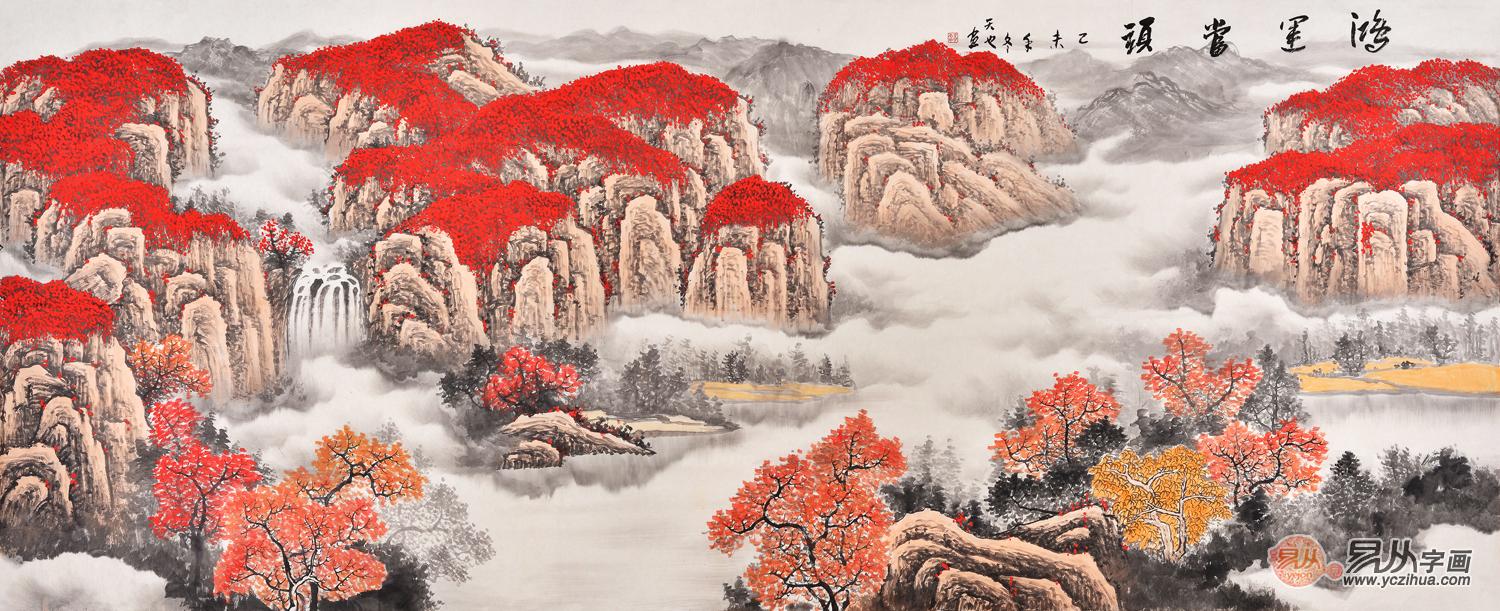 易天也风水画作品《鸿运当头》 作品来源:易从网易天也的这幅表现秋叶正红景象的鸿运当头寓意画,把万山红遍的高山与瀑布喧嚣的沟壑,以及长青的松树有机融汇在一起,构成了完美的“鸿运当头”的视觉艺术。以朱砂色点台涂叶,寓意鸿运当头,吉祥如意,群山巍峨乃靠山之意,瀑布代表财源滚滚,整幅画面以红色调为主,红光四射吉庆有余,乃大吉大利之兆!让观赏者得到艺术的享受,得到美好的祝福。此幅作品赏之令人愉悦,雅室生香,极具装饰价值。好了,以上就是为大家推荐的挂在客厅倍有面的这几款高颜值装饰画,希望对大家有所帮助!客厅装饰画建议选择山水画,山水画是我国传统的吉祥画,常青、背靠大山、水(财)长流、平安之意。所以,在室内挂上一幅的山水画作品是相当不错的!