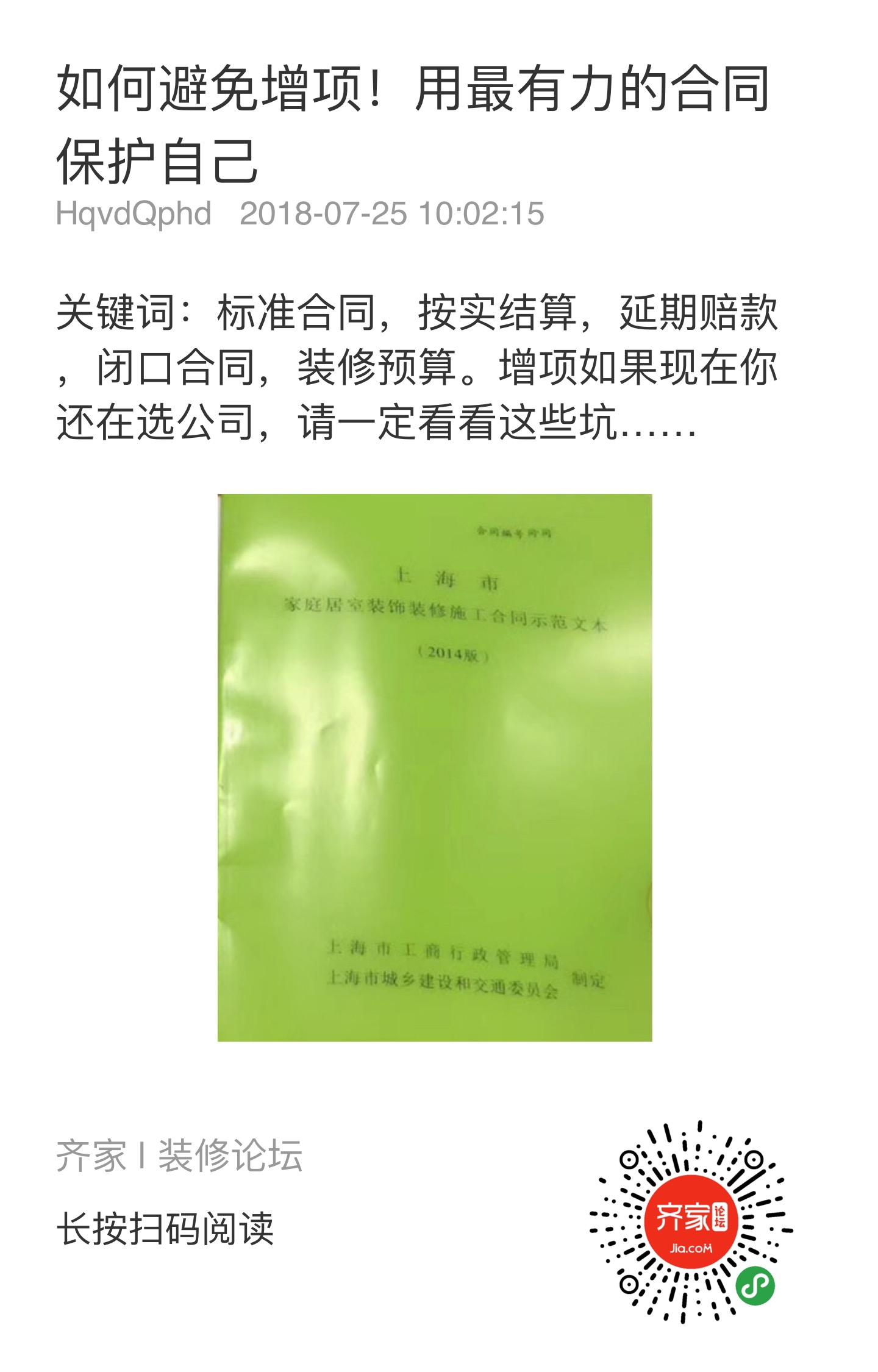 我有齐家保的。所以根据齐家上的付款进行支付。第三期已经付了,只剩一点尾款了。增项齐家估计也不会参与吧。一点都不懂就选了这家了,我妈觉得设计师看着老实。现在我再看看当时人家设计师给的预算,没有漏项。弱电箱,网格布,石膏线,过门石都有,这里都没。真的是花钱上课