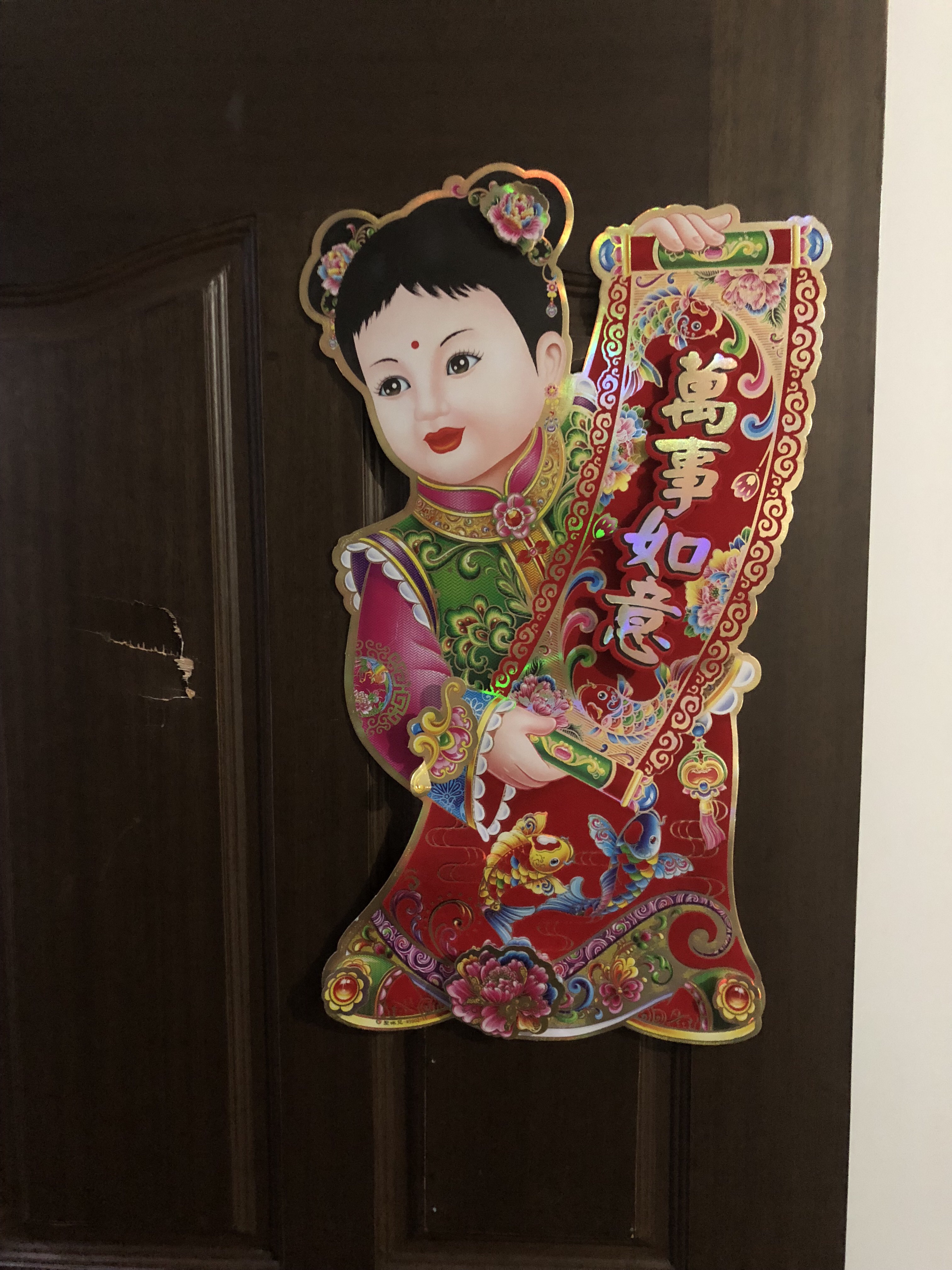 我租的房子的这破门好像合适这么搞,我用的是年画遮丑,还讨一点喜气。