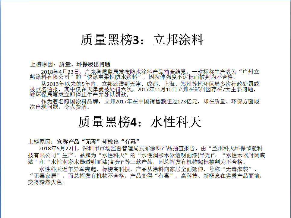 这个评选有依据和权威性吗?质量问题是整体还是局部,是偶尔还是长期?里头可都是大牌呢?水性科天是姚明做的代言呢~ 姚明怎么没去世界杯?立邦是大牌哦,大牌都这样,我们怎么活?