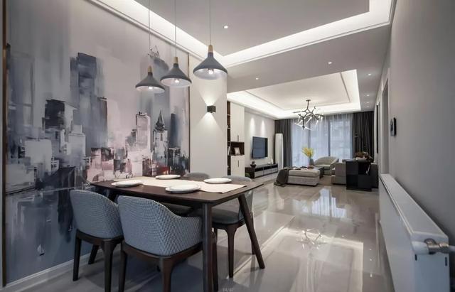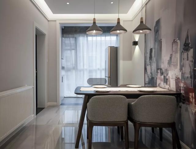 整个餐厅的空间比较小,一幅远景城市壁画,在视觉上起到拉伸整个空间的作用,餐桌一面靠墙,就像是一处静谧的约会之地,充足的灯照,可以很好的看清美食,促进食欲哦~。主 卧