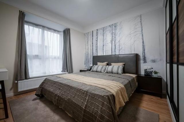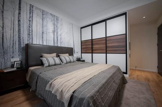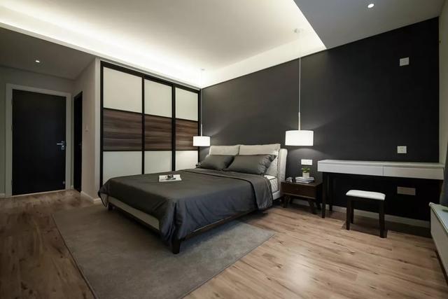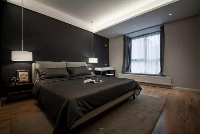 黑色在这里大面积的运用,并没有显得压抑,反而在这光线明亮又充足,自然质感的木纹地板和衣柜的空间里,一切搭配到恰到好处,给人一种非常高级的感受。次 卧