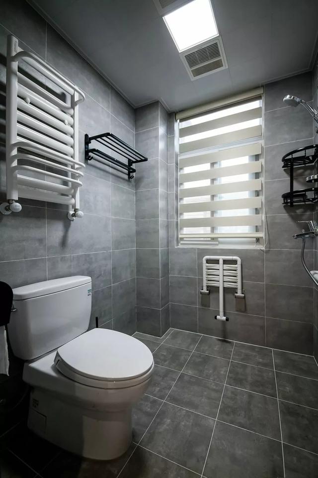 卫生间也随主色调,黑白灰,充满着神秘,大气。马桶上方置物架,很强的实用性哦。百叶窗透气性和隐蔽性并存,实用又好看。
