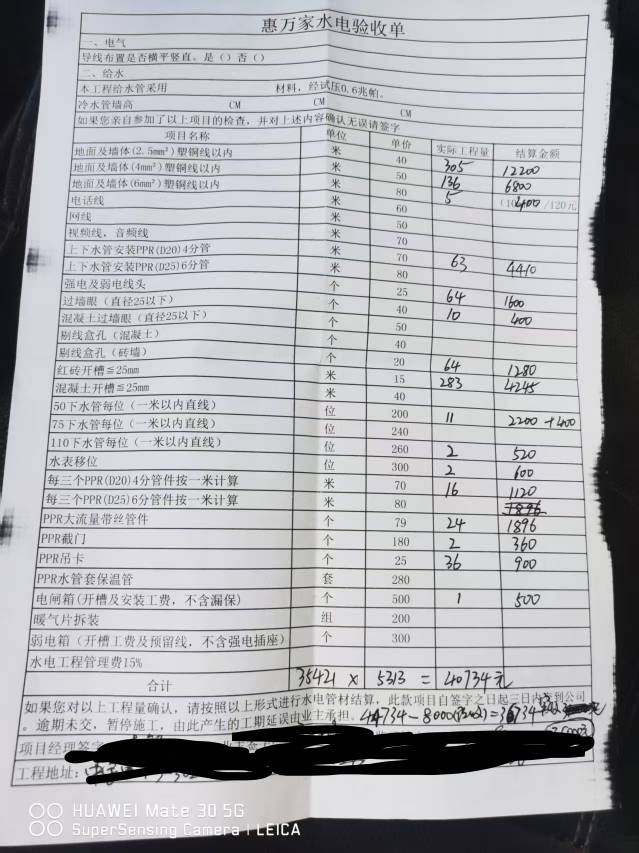 水电改造,预收8000元。改造费用另计。但闸箱,空开需自购。施耐德18路闸箱空开一套,费用570元。改造完。又收费4万余元,经商讨优惠后,收取35000元。