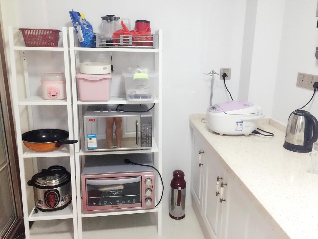 还有你这个厨房里面,这个移动的收纳架可以尝试做成橱柜 ,找做橱柜的人来量一量规划下,锅碗瓢盆的都收进去,微波炉烤箱什么的都内嵌进去。架子摆这边,你家厨房会越来越辣眼睛的。