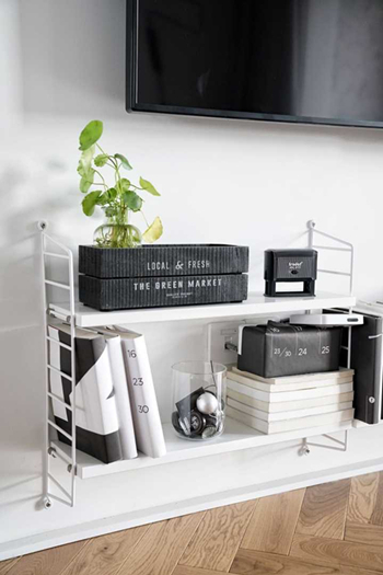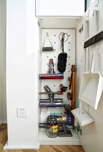 书房带个小阳台,两边做了柜子,柜子里还有包管,剩下深度也就二三十公分吧,本来挺鸡肋的,装了块洞洞板,把所有清洁工具都挂进去了,实在没地儿放的,灵机一动在柜门上粘了挂钩。