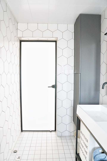旁边还有个细高的大吊柜,正好洗手盆底下没有储藏空间,护肤品啊卫生纸啊清洁用品啊都放柜子里,柜底下还能塞个脸盆啥的。卫生间门的细框,只有2cm多宽,找遍市场只有一个牌子能做,细节方面完美,跟铁艺小店比,那叫一个天上一个地下(又想起洗手台架子,心酸)。没做门套,就是直接瓷砖贴过去,装修中想要跟别人不一样的地方,全靠自己烧脑子,别人只会让你不要做,自己不坚持就永远不知道怎么解决!