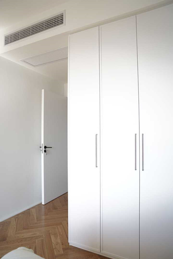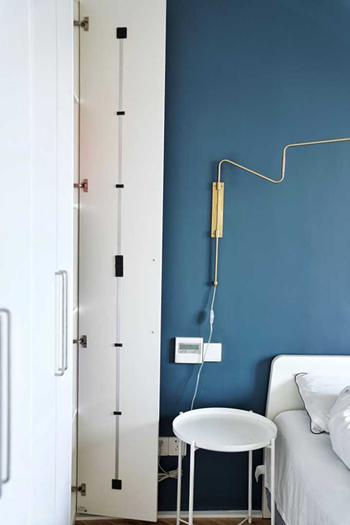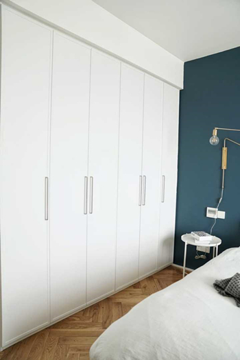 七、卧室卧室比较省心,除了定顶天立地的大衣柜。其实门板如果超过两米,大部分厂家都不愿意做了,说会变形,一般让做分段的,或者有造型的,边上可以固定一下。小Y的柜门不想分段,又要平板,找了好多家都不愿意做,后来有家说可以用拉直器,装在门板背后的,这样就不容易变形。