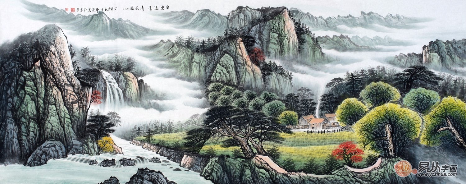 薛波新品国画山水作品《白云逸意 清泉洗心》 作品来源:易从网【作品解读】:此画构图饱满,采用远近构图,峰峦叠嶂树木丰茂,山泉溪流泽泽,云气缭绕雾霭沉沉,房舍隐现宛若人间仙境,意境清幽。图中疏密相间,前后虚实空间层次丰富,山石结构严谨。观此作品便知这是一幅大气磅礴的作品,彩墨交融,画中景物有动有静,别具生气。此佳作具有很高的收藏价值,适合悬挂在会所、酒店、客厅等地大气磅礴。薛波山水画作品欣赏二、经典风水画旭日东升: