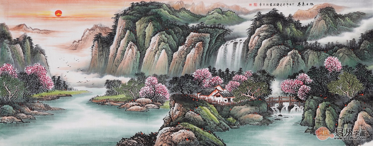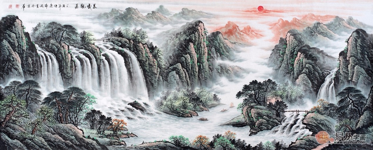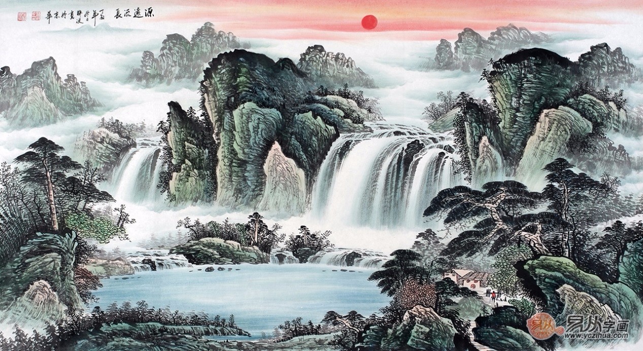 客厅风水画 薛波松泉飞瀑图《源远流长》 作品来源:易从网【作品解读】:此幅作品春意黯然、生机勃勃,流水潺潺预示着财源滚滚,前有聚宝盆,后有红日高照,一幅吉祥如意,鸿运当头的风水佳画呈现在我们面前。作品中流淌的瀑布代表着财源滚滚、生生不息的含义,下面的溪水汇流形成聚宝盆的形状,意味着水不外流,即财不外流,也就是招财聚宝盆。本作品体现了山水画与风水的有机结合。背山面水,山环水抱;后有靠山,前有财源,左右“青龙、白虎”护卫,这是一幅非常完美的聚宝盆山水画。此作品最适合于客厅、办公室或大堂,艺术欣赏价值和风水寓意两者兼得。薛波山水画作品欣赏五、鸿运山水图: