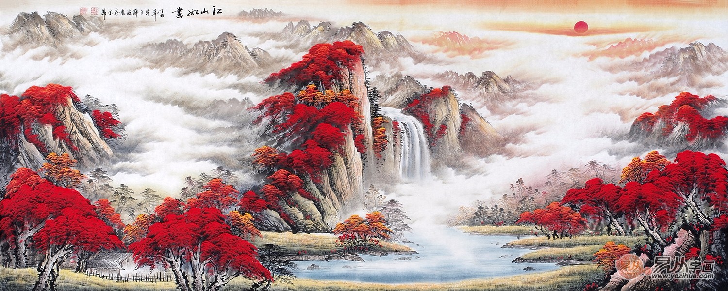 鸿运天成聚宝盆 薛波最新力作山水画《江山如画》 作品来源:易从网【作品解读】:山岚峰起,云层环绕,枫林披覆,旭日东升,鸿运普照,溪水潺潺;作品大气磅礴,气势宏大,中心的主山巍峨,高入云端。云瀑从高处流到山下,寓意着祥云天降,源水长流。山脚下有两三处房屋,自然而毫无违和感,背靠大山,即有贵人相助,好运连连,真是鸿运当头!这幅作品寓意吉祥、气势宏大,画家用犀利的笔法和清雅通透的染色技法,让作品厚重中显轻盈、大气中透雅致。一轮红日朝气蓬勃,染红了山峦,给人一种鸿运当头的即视感,挂在家中更显意韵,风水极佳。多年来,经过长期的写生积累,创作一系列的新面貌,作品曾多次荣获国内外大赛,并荣获多项奖誉,入编国内外大型画集、画刊,其优秀作品被许多国内外知名人士及美术馆收藏,并在《美术》、《中国画家》、《中国书画报》等报刊杂志发表。