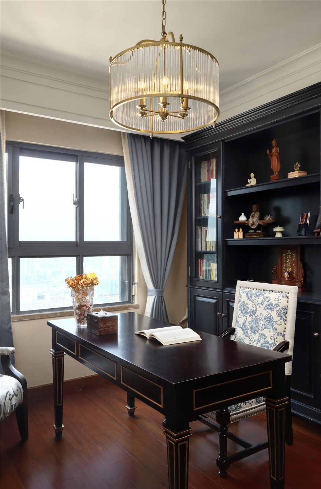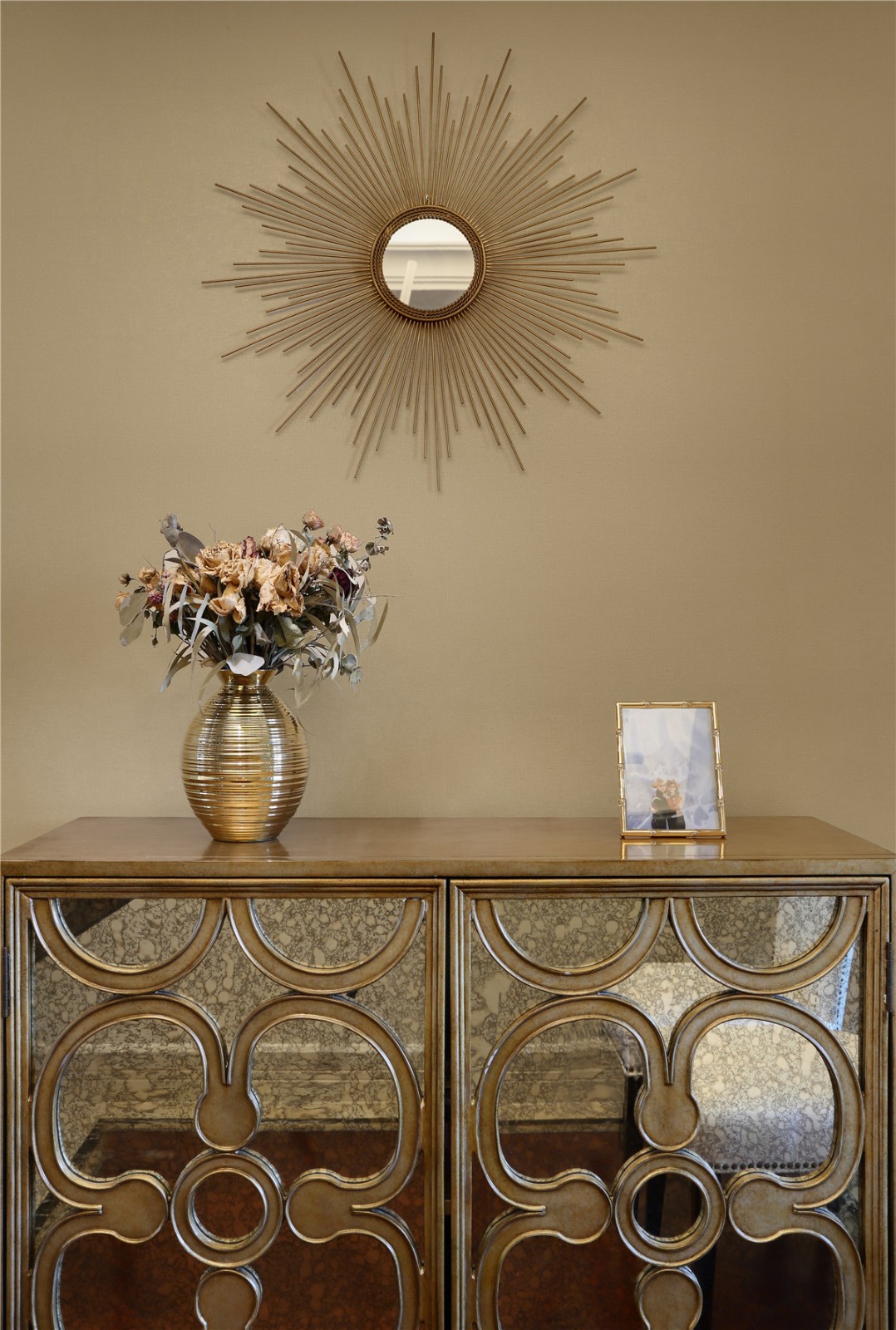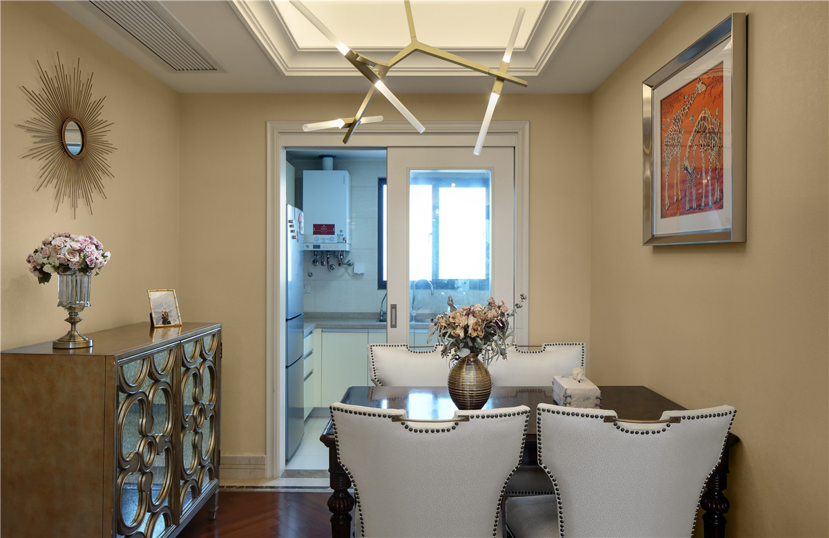 餐厅灯具的应用上则偏向极简化一些。装饰摆件的金属感以打破一种传统的沉闷,小空间需要一些点睛的东西来提升。书房